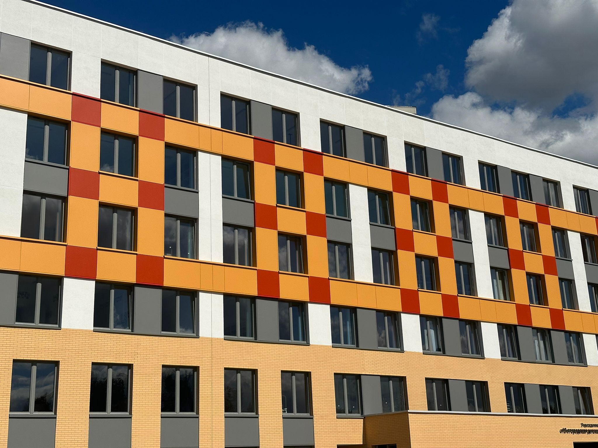 Для оформления фасадов были выбраны фиброцементные плиты LTM. Ярко окрашенные панели Cynop выделяются на общем фоне фасада и акцентируют внимание на отдельных элементах.